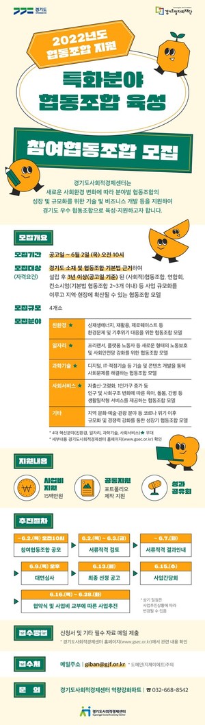 경기도일자리재단 경기도사회적경제센터가 다음 달 2일 오전 10시까지 '특화분야 협동조합 육성사업' 참가기업 4개 사를 모집한다.'특화분야 협동조합 육성사업'은 코로나19 이후 사회환경 변화에 따른 협동조합 특화분야를 선정, 분야별 협동조합의 성장을 지원해 경기도 우수 협동조합을 육성하는데 목표가 있다.이번 모집에서는 친환경, 일자리, 과학기술, 사회서비스 등 특화분야 협동조합을 선정해 사업화 전략 수립, 재화 서비스 및 기술 개발(개선), 생산·품질 강화를 지원한다. 사업 규모화와 확장을 위해 선정된 협동조합에는 최대 1500만 원