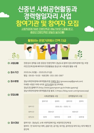 경남사회연대경제사회적협동조합에서는 직장에서 퇴직한 전문가들의 업무능력, 지식과 경력을 활용하는 사회 공헌 활동과 단기 일자리 사업을 운영한다.참여자는 만 50세 이상 대학, 금융기관, 공기업, 대기업, 공무원 등 퇴직 또는 퇴직 예정 전문 인력이며, 전문 인력에 대한 활동비는 운영기관에서 전액 지급한다.사업은 '사회공헌 활동'과 '경력형 일자리' 두 가지로 구분하며 활동의 내용으로는 경영전략, 마케팅홍보, 인사노무, 재무회계금융, 행정지원, 상담멘토링 등으로 다양하다. 분야에 맞게 참여기관과 참여자가 매칭된다.먼저, 사회공헌 활동은