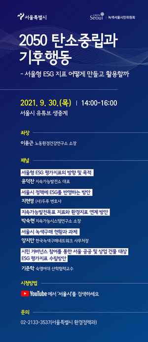 서울시와 녹색서울시민위원회(이하 녹색위)는 2050 탄소중립 도시 달성을 위해 서울형 ESG(Environmental, Social and Governance, 기업의 비재무적 요소인 환경·사회·지배구조를 뜻하는 말) 지표를 개발하고 활용 방안을 모색하는 '2050 탄소중립과 기후행동 – 서울형 ESG 지표 어떻게 만들고 활용할까' 토론회를 오는 30일 오후 2시에 개최한다. 시는 최근 기후위기에 대응하기 위해 기업에서 필수요소로 다루는 ESG 경영을 시정에 직접 도입해 구체적 실행계획을 도출하고, 환경문제 해결 등 장기적으로 도시