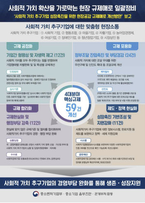 정부가 사회적 가치 확산을 가로막는 핵심규제 59건을 개선해 기업들이 느끼는 현장의 애로사항을 정비하고 사회적 가치 추구기업에 대한 성장 촉진을 지원한다.중소벤처기업부(이하 중기부)와 중소기업 옴부즈만은 15일 '제115차 국정현안점검조정회의'에서 '사회적 가치 추구기업 성장 촉진을 위한 현장공감 규제애로 개선방안(관계부처 합동)'을 발표했다.사회적 경제 활성화는 핵심 국정과제로 양질의 일자리 창출(취약계층 기회제공), 지역공동체 활성화 등 사회적 가치를 실현하고 있다. 그러나 사회적 가치를 추구하는 기업들은 기업유형별 차이에 따른