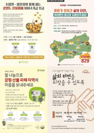소비자생활협동조합(생협)들이 강원지역 산불로 피해를 입은 이재민들을 위한 지원에 발 벗고 나서고 있다. 16일 업계에 따르면 두레생협, 아이쿱생협, 한살림, 행복중심생협 등 국내 대표생협들이 지난 4일 산불로 큰 피해를 입어 어려움을 겪고 있는 강원도지역 이재민을 돕기 위해 후원금 모집을 진행 중이다. 두레생협은 이달 15일부터 26일까지 조합원·생산자와 함께하는 '강원도 산불피해 1004 기금' 모금을 진행 중이다. 두레생협은 온라인 장보기(www.dcoopmall.com/dcoop/)에 '산불피해 기금 모금