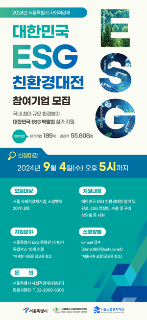 서울특별시 사회적경제지원센터(이하 센터)가 '대한민국 ESG 친환경대전' 참여기업을 모집한다.이번 사업은 관내 환경 분야 사회연대경제기업(사회적경제기업)의 육성과 판로 지원을 위해 마련됐다.센터는 공모를 통해 10월 10일부터 12일까지 열리는 환경부 주최 '대한민국 ESG 친환경대전'에 참여할 기업을 선정하고 '서울특별시 ESG ECO 혁신기업관(가칭)'과 '기업별 독립부스' 부스를 각 10개 기업에 지원한다(총 20개 기업 지원).선정기업에는 ▲전시 부스와 홍보 및 판로 지원 ▲ESG 컨설팅 및 수출‧구매 상담회 등 부대행사 참
