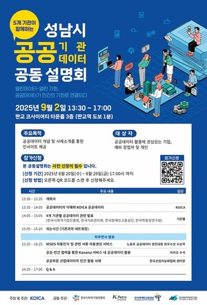 성남시 내 5개 공공기관이 참여하는 '공공기관 공공데이터 공동 설명회'는 9월 2일 오후 1시 30분부터 판교 코사이어티 타운홀 3층에서 열린다.이번 설명회는 한국국제협력단, 한국사회적기업진흥원, 한국석유관리원, 한국장애인고용공단, 한국학중앙연구원이 공동으로 마련했으며, 공공데이터 개념과 사례를 소개하고 관련 인사이트를 제공하는 자리가 될 예정이다. 행사에서는 ▲KOICA 공공데이터 소개 ▲참여 기관별 공공데이터 발표 ▲MSDS 자동입력 및 관련 서류 자동생성 서비스 ▲공공-민간 협력을 통한 신용공공데이터 활용 ▲공공부문 산업데이터