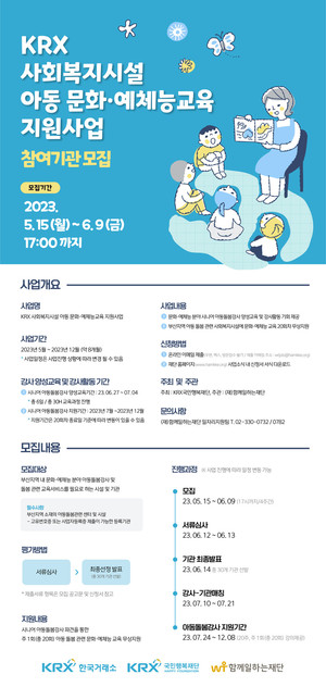 함께일하는재단은 KRX국민행복재단과 함께 진행하는 '사회복지시설 아동 문화·예체능 교육 지원사업'을 통해 문화·예체능 돌봄 프로그램을 지원 받고자 하는 참여기관과 시니어 아동돌봄강사로 참여할 부산 지역 시니어 참가자 모집을 한다고 16일 밝혔다.양 조직은 취약계층 아동의 교육격차 해소와 공익서비스형 시니어 일자리 창출을 위해 다양한 협력 사업을 펼쳐 나가고자 이번 사업을 기획했다. '사회복지시설 아동 문화·예체능 교육 지원사업'을 통해 참여기관은 부산 지역의 총 30개 시설 또는 센터를 모집하여 주 1회, 총 20회의 문화·예체능
