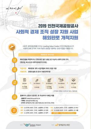 인천국제공항공사가 사회적경제조직의 지속가능한 성장을 지원하는 공모사업을 시행한다.(재)함께일하는재단은 인천국제공항공사가 해외판로 개척지원 사업에 참여할 사회적경제조직을 모집한다고 28일 밝혔다.해외판로 개척지원 사업은 사회적경제조직 육성 및 국내 사회적경제 활성화를 목표하는 '2019 인천공항과 가치가세' 사업의 일환으로 사회적경제조직의 수출 활성화를 통해 글로벌 경쟁력을 강화해 사회적 가치를 확장시킬 수 있도록 사업개발비 및 자원연계를 지원할 계획이다.해외판로 개척지원 사업에 참여를 희망하는 사회적경제조직은 10월
