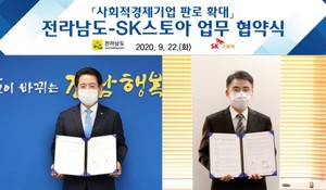 전라남도와 SK스토아가 전남 사회적경제기업의 판로 확대를 위한 업무 협약을 체결했다.전라남도와 SK스토아는 사회적경제기업 제품의 경쟁력 강화와 판로 확대를 위한 업무 협약식을 22일 전라남도청에서 진행했다. 협약식에는 김영록 전라남도 지사와 윤석암 SK스토아 대표가 참석했으며, 코로나19 확산 방지를 위해 화상회의 시스템을 통한 비대면 방식으로 진행됐다.이날 업무협약 체결에 따라 전라남도는 도내 사회적경제기업들이 다양한 사업을 발굴하고 자립, 성장하는 데 밑거름이 될 수 있는 교두보 역할을, SK스토아는 제품 품질 및 경쟁력 향상에
