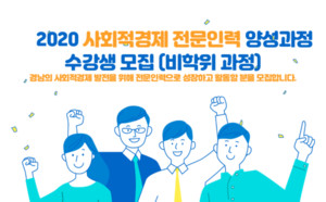 경상남도와 경남과학기술대학교가 오늘(28일)까지 "2020년 사회적경제 전문인력 양성과정"의 수강생을 모집한다. 사회적경제 전문인력 양성과정은 비학위과정이며, 지역의 사회적경제 생태계 조성과 발전에 기여할 사회적경제 전문인력 양성 및 배출을 목적으로 8월부터 12월까지 총 5개월동안 18회차에 걸쳐 진행된다.모집대상은 사회적경제 관련 종사자, 지자체 공무원, 지역혁신 마을활동가, 공공기관 및 기업 CSR·CSV 관련 담당자, 사회적경제 전문강사, 시민사회단체 실무자, 컨설턴트, 대학(원)생이며, 총 40명을 선발한다.올해 교육과정의