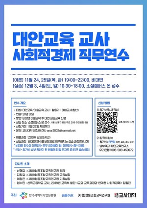 대안교육 그리고 지역과 학교가 함께 하는 마을교육 교원을 대상으로 사회적경제 교육 직무연수 과정이 열린다. 한국사회적기업진흥원(이하 진흥원)이 주최하고 사회적협동조합 협동조합교육연구원과 삶을 위한 교사대학이 함께 주관하는 이번 교육은 11월 24일과 25일에 온라인 이론 수업을 진행하고 12월 첫째 주에 서울시 성동구에 위치한 소셜캠퍼스온 성수에서 실습 과정이 진행된다. '대안교육 교사 사회적경제 직무연수'는 ▲대안교육과 마을교육 교사 ▲활동가 ▲예비교사(청년)이 참여 가능하며 20명 내외로 운영된다. 신청 기간은 11월 22일까지