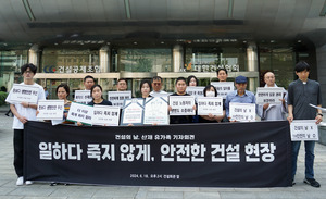 "일하다 죽지 않게!""안전한 건설 현장 만들어라!""중대재해법을 지켜라!"건설의 날인 6월 18일, 서울 강남구 건설회관 앞에서 '안전한 건설 현장 만들기'를 촉구하는 목소리가 울려 퍼졌다. 산업재해(이하 산재) 유가족과 5대 종교 단체 성직자, 생명안전 시민넷 관계자들이 정부와 건설사에 건설 업계 노동자들의 생명과 안전을 보호하기 위한 실질적 대책 마련을 요구하며 기자회견을 개최한 것이다. 초여름의 더운 날씨에도 참석자들은 한 시간가량 자리를 지키며 산재 없는 안전한 노동 현장 실현을 바라는 마음을 모았다.기자회견은 산재 현장에