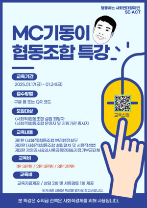 '행동하는 사회연대경제 SE-ACT(이하 SE-ACT)'가 협동조합 설립절차, 변경행정, 경영공시 등과 관련해 'MC 기동이 협동조합 특강'을 연다. 강사 'MC기동이'는 이기대 SE-ACT 공동추진위원장으로 서울시 협동조합지원센터 상담지원팀장이었으며 현재 기본소득당 사회연대경제국장을 맡고 있다. 이번 교육 수익금 전액은 사회연대경제 활성화를 위해 기부될 예정이다. 특강은 3개로 구성돼있다. ▲제1탄 '(사회적)협동조합 변경행정 이해'는 17일과 19일, ▲제2탄 '(사회적)협동조합 설립절차 이해 및 서류작성법'은 23일과 24일,