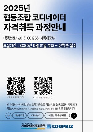 협동조합 설립과 운영을 전문적으로 지원할 인력을 양성하기 위한 '협동조합 코디네이터 자격취득 과정'이 오는 9월 18일부터 11월 6일까지 진행된다. 이번 교육은 총 7회차, 21시간으로 구성되며, 수료 후에는 11월과 12월 두 차례에 걸쳐 자격검정시험이 이어질 예정이다. 협동조합 코디네이터는 협동조합의 설립과 안정적인 운영을 돕는 전문 자격으로, 구성원의 역량을 진단하고 개선 과제를 제시하는 역할을 수행한다. 또한 운영 과정에서 필요한 상담과 지도를 제공하고, 교육과 기초 컨설팅을 통해 현장의 다양한 요구를 충족할 수 있는 실무