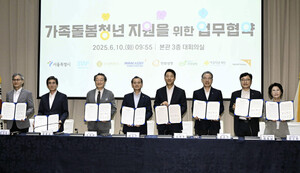 서울시가 가족을 돌보며 생계를 책임지는 청년들을 위해 기업·단체와 함께 다방면의 지원에 나선다. 서울시는 10일 오전 서울시청(3층 대회의실)에서 ▲미래에셋 박현주재단 ▲아름다운재단 ▲롯데백화점 ▲희망친구 기아대책 ▲한화생명 ▲월드비전과 가족돌봄청년 지원을 위한 업무협약(MOU)을 체결했다고 밝혔다. 이번 협약은 가족돌봄청년의 자산 형성, 심리 안정, 일상 돌봄을 지원하기 위한 민관 협력 모델로 기존 생계 지원을 넘어 지속 가능한 삶의 기반 마련을 목표로 한다.