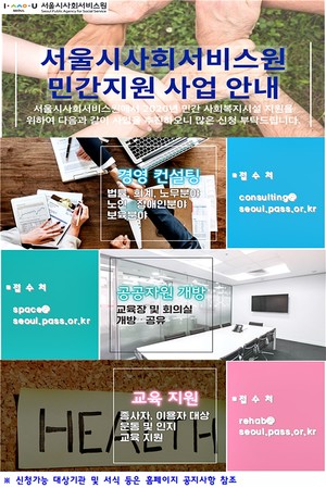 서울시사회서비스원(대표이사 주진우)이 민간기관 지원사업을 본격적으로 추진한다고 밝혔다.2020년 민간 지원 사업의 핵심사업 내용은 사회서비스 제공 기관을 대상으로 하는 법률‧회계‧노무, 노인‧장애인‧보육 분야별 '경영 컨설팅', 본부‧소속기관 회의실‧교육장 등 '공공자원 무료 대관', 종사자 등 대상 운동 및 인지 '교육 지원'이다.서울시사회서비스원은 사업을 체계적으로 추진하기 위해 2020년 2월에 2019년 채용된 상근 노무사 외 변호사, 회계사를 추가 채용하고 분야별 컨설팅 경력이 풍부한 외부 전문가 풀을 구성한 바 있다.아울