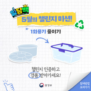 환경부가 10일부터 올해 말까지 일회용품 사용줄이기 실천운동 '일당백(일회용품 줄이는 당신은 백점)'을 실시한다. 이번 실천운동은 올해 2월부터 시작한 '일회용품 제로 챌린지'에 이은 대국민 참여형 캠페인으로, 일회용품 줄이기에 약속을 넘어 실천을 독려하기 위해 마련됐다.참여 방법은 장바구니 및 다회용컵 사용 등 일회용품을 사용하지 않은 모습을 촬영하여 필수 해시태그(#일당백챌린지, #1회용품없는날, #환경부)와 함께 개인 사회관계망서비스에 게재하고, 게시물을 양식에 맞춰 환경부로 제출하면 된다. 제출 기간은 매달 10일부터 일주일