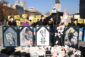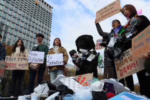 '환경부 1회용품 사용규제 철회 규탄 전국공동행동(이하 전국공동행동)'이 지난 21일 18개 지역에서 기자회견 및 1인 시위 등을 진행한 가운데, 서울지역에서는 광화문광장에서 기자회견을 열고 환경부의 정책 후퇴를 비판하는 퍼포먼스를 선보였다. 환경부 가면을 쓴 사신이 1회용품 쓰레기로 죽은 동물과 인류의 영정 사진 앞에서도 여전히 1회용품을 투척하고 있는 모습이다.지난 7일 환경부는 '일회용품의 계도기간 종료에 따른 향후 관리방안'으로 비닐봉투 과태료 부과 철회, 플라스틱 빨대 계도기간 연장, 종이컵 사용규제 철회 등을 발표했다. 전국공