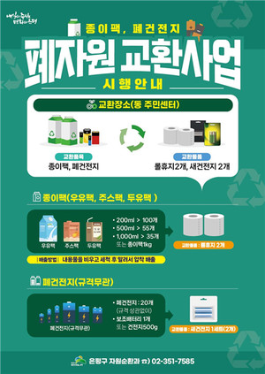 서울시 은평구가 이달부터 종이팩과 폐건전지를 두루마리 휴지와 새 건전지로 바꿔주는 '폐자원 교환사업'을 추진한다고 밝혔다.현재 은평구 공동주택에는 폐건전지 전용 수거함이 있음에도 불구하고 건전지 부피가 작아 무심코 일반 종량제 봉투에 버리는 경우가 많았다.이에 구는 폐자원의 수거율을 높이고 주민들이 직접 자원 선순환 활동에 참여할 기회를 제공하고자 '폐자원 교환사업'을 마련했다. 폐종이팩은 두루마리 휴지로, 폐건전지는 새건전지로 바꿔준다. 폐종이팩은 우유팩, 주스팩, 두유팩 등 재활용 가능 표시가 있는 살균팩 또는 멸균팩이며, 이를