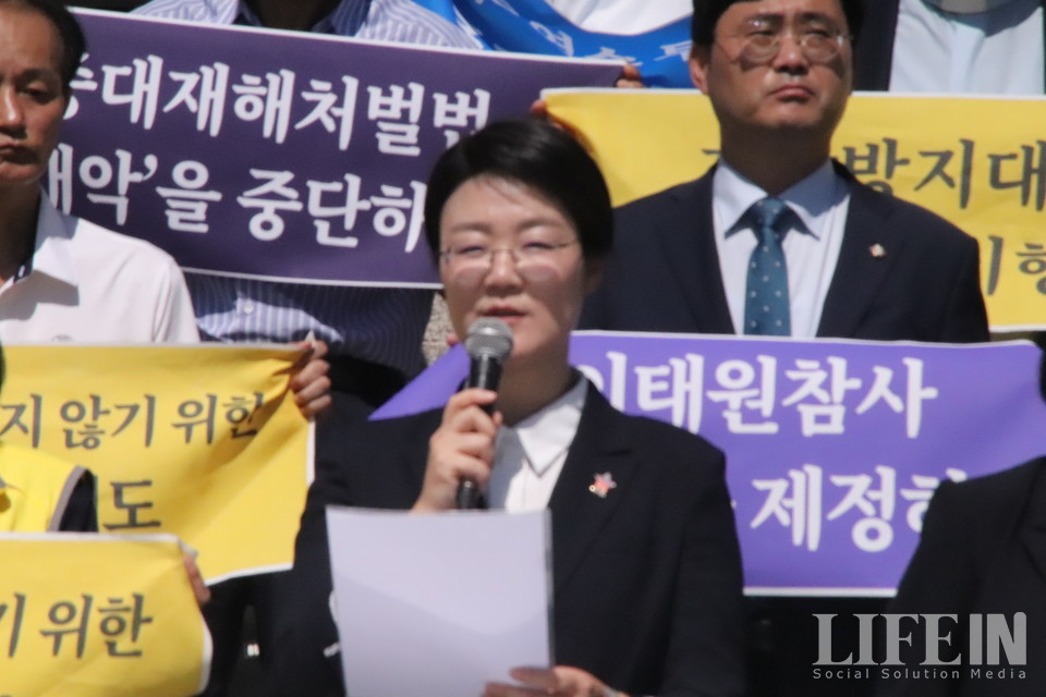 김미숙 대표는 "유족을 입에 발린 말로 위로하지 말라. 진정성 있는 위로는 사회가 생명안전을 중시해서 반복되는 참사를 막는 것뿐"이라고 단언했다. "정부가 국민 안전을 외면하니 국민들이 살기 위해 중대재해처벌법을 만들었고 시행된 지 1년 8개월이 지났지만 산업현장에는 달라진 게 없으며 매년 2,400명 이상이 소중한 목숨을 잃었다"라며 "산업과 생활, 법제 모든 분야에 걸쳐 생명안전 토대를 구축하기 위해 생명안전기본법의 조속한 제정을 국회에 호소한다"고 외쳤다.