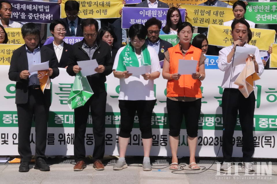 '국회는 생명안전 의제를 최우선으로 논의해야 한다'는 주장과 함께 5대 부의제로 ▲이태원참사 특별법 제정 ▲핵 오염수 투기 중단 ▲중대재해처벌법 개악 중단 ▲생명안전 후퇴 중단 ▲생명안전기본법 제정 등을 강조했다.