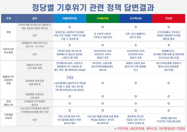 정당별로 선거관리위원회에 제출한 공약에는 기후위기 관련 정책을 언급하고는 있지만, 정책 우선순위나 그 해법에는 정당마다 차이가 크다. 예를 들면, 녹색정의당의 경우는 기후정책을 1순위, 민주당과 조국혁신당은 3순위, 진보당은 4순위, 새로운미래는 6순위, 국민의힘과 개혁신당은 10순위로 두었다.