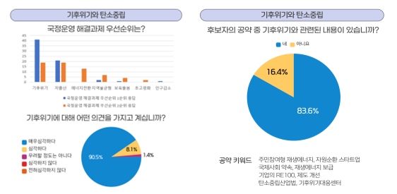 우리사회가 우선 해결해야 할 정책 과제에 대해 후보자 대부분이 '기후위기'와 '저출산'이라고 답했다. 기후위기 심각성에 대한 물음에는 98.6%(이중 95%가 '매우 심각하다'고 답변)%가 '심각하다'고 답했다.