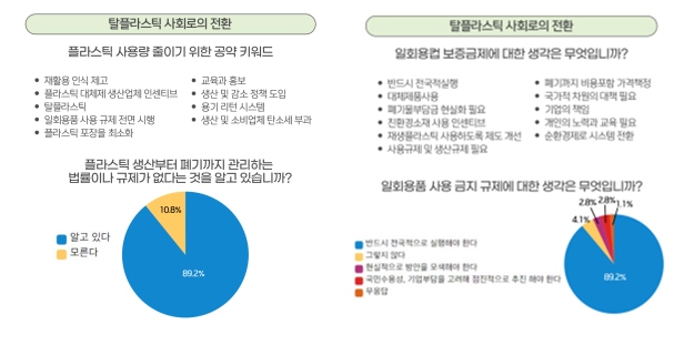 일회용컵 보증금제 확대나 일회용품(일회용 플라스틱 포함) 사용금지 규제 필요성에 대해서는 90%이상이 '찬성한다'고 답했다. 이를 위해 일회용품에 대한 포괄적 규제 도입, 재사용 가능한 제품에 대한 인센티브 제공, 지속 가능한 포장재 개발 촉진, 재활용 체계 강화 등의 방안이 제시됐다.