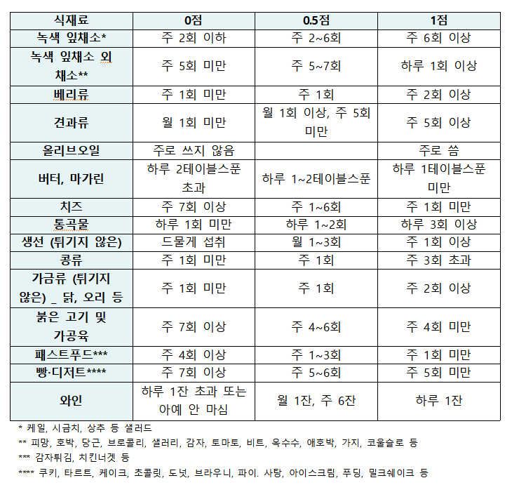 먼저 식습관을 살펴보자. 위의 MIND 점수표로 간단하게 확인해 볼 수 있다. 총점이 15점에 가까울수록 노화에 대비한 식습관을 잘 갖추고 있는 것이다.