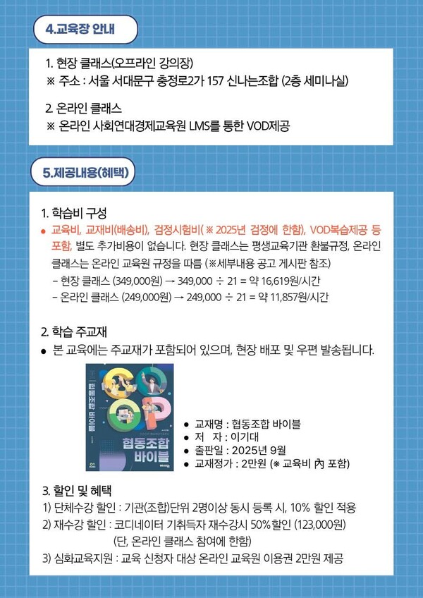 교육은 현장과 온라인을 병행해 운영된다. 현장 강의는 서울 서대문구 신나는조합 세미나실에서 열리며, 모든 강의는 실황으로 녹화돼 온라인 학습자에게 VOD 형태로 제공된다. 온라인 과정의 참여자들은 강의 기간 동안 최소 세 차례 이상 줌(Zoom)을 통한 강사와의 질의응답 시간을 갖게 된다. 이번 과정의 주교재는 이기대 저자의 '협동조합 바이블'로, 2025년 9월 출간 예정이며 수강료에는 교재비와 시험 응시료, VOD 제공 비용이 모두 포함돼 있다.