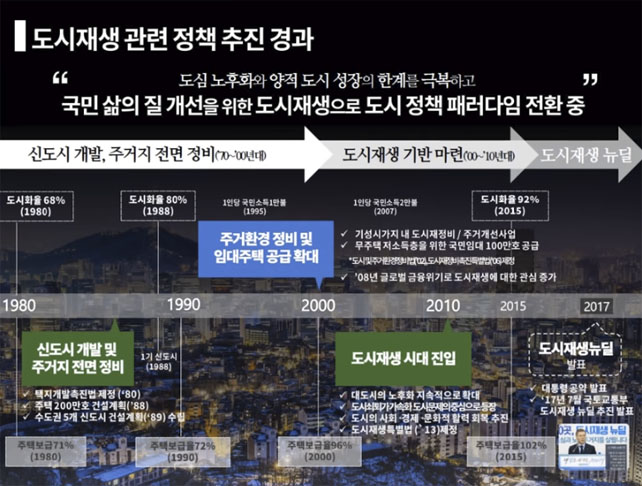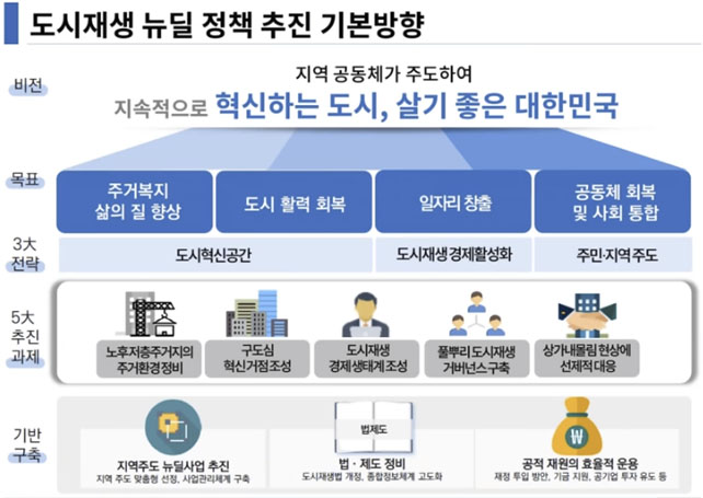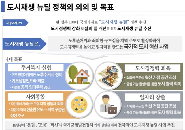 현 정부의 100대 국정과제 중 하나인 '도시재생 뉴딜정책'은 ▶주거복지 실현 ▶도시경쟁력 회복 ▶사회통합 ▶일자리 창출 등을 기본 목표로 한다. 노후주거지와 쇠퇴한 구도심을 지역 주도로 활성화해 도시경쟁역을 높이고 일자리를 만드는 국가적 도시 혁신 사업이 바로 도시재생 뉴딜정책이다.