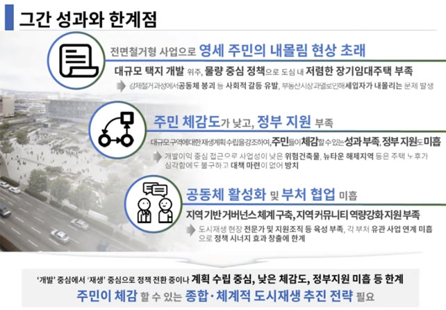 그는 "정부는 '도시재생 뉴딜' 및 다양한 정책들이 국민들에게 체감되지 않는다고 판단하여 각 부처마다 사업의 조기 진행을 요구하지만 현재 사업에 비해 국토부 도시재생기획지원단의 인력은 턱없이 부족하고, 지원기구 역시 한계치에 다다르고 있다고 판단된다"며 "공동체와 사회적경제가 어느 정도 진행되려면 10년 이상은 진행되어야 하며 그 보다 복잡한 도시재생이 어느 정도의 성과가 객관적으로 나타나는 건 그 이상의 시간이 필요하다"고 지적했다. 그러면서 "반대로 사회적경제 조직이 도시재생 뉴딜정책에서 사회적경제 중심의 정책과 사업단위 참여 역시 바로 '정답'이 나올 수 없다"며 "협의 혹은 광의의 사회적경제와 상관없이 당사자조직 스스로 준비하면서 적극적으로 참여할 것"을 요구했다.