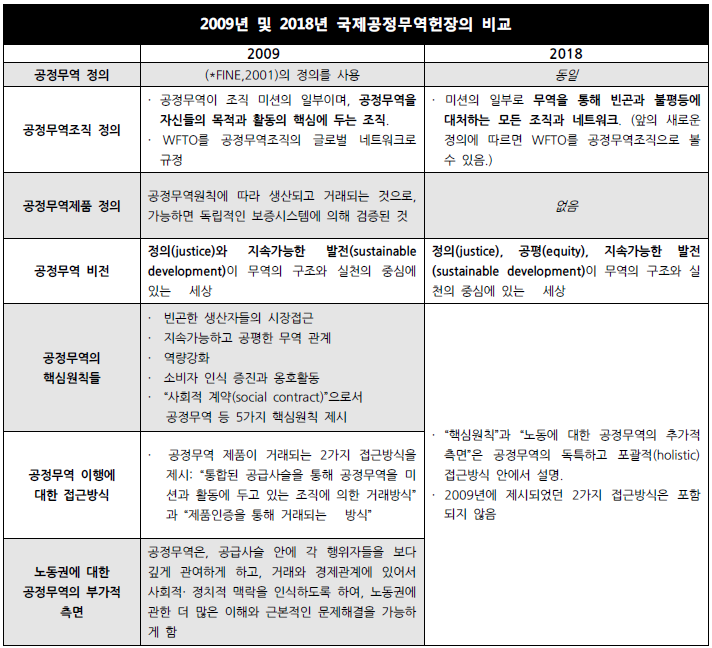 공정무역의 기본철학과 정의 그리고 핵심원칙은 새로운 헌장에서도 변함이 없다. 그러나 “공정무역단체(Fair Trade Organization)” 정의와 “공정무역의 비전”에는 변화가 발견된다. 과거 공정무역단체는 “공정무역”을 미션의 일부로 가진 단체이었다. 그러나, 새 헌장에서는 공정무역단체를 “무역으로 빈곤과 불평등에 맞서는 것을 미션으로 하는 단체와 네트워크”로 재정의했다. “단체(Organization)”만을 포함했던 공정무역단체의 범위가 “조직과 네트워크”로 확장된만큼 단체의 형태와 규모에 관계 없이 공정무역을 수용할 수 있음을 의미한다. 또한, 공정무역이라는 단어 대신 그 실천을 강조한 것으로도 해석된다.