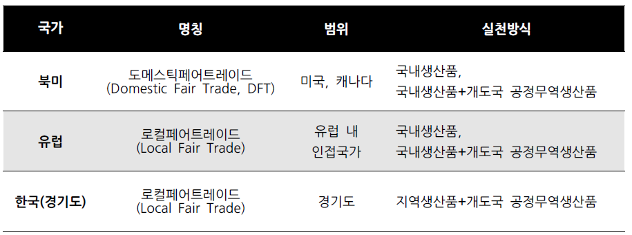 로컬페어트레이드운동은 북미와 유럽에서 다양한 명칭과 범위, 방식을 통해 실천되고 있다. 유럽의 경우 국가 혹은 조직마다 서로 다른 명칭을 사용하기도 한다. 한국에선 최근 경기도가 이 명칭을 도입했다. 그러나 ‘로컬(local)’의 범위는 용어를 사용하는 사람에 따라 달라질 수 있다. 유럽권 전체를 로컬이라고 본 유럽과 달리, 경기도는 도 내로 로컬의 범위를 국한하고 있다. 100% 국내에서 생산된 제품에도 로컬페어트레이드라고 이름을 붙이는 북미와 유럽과는 다르게 한국은 지역생산품과 개도국의 생산품을 혼합하여 만든 가공품만을 다루고 있다는 점도 주목할 만하다.