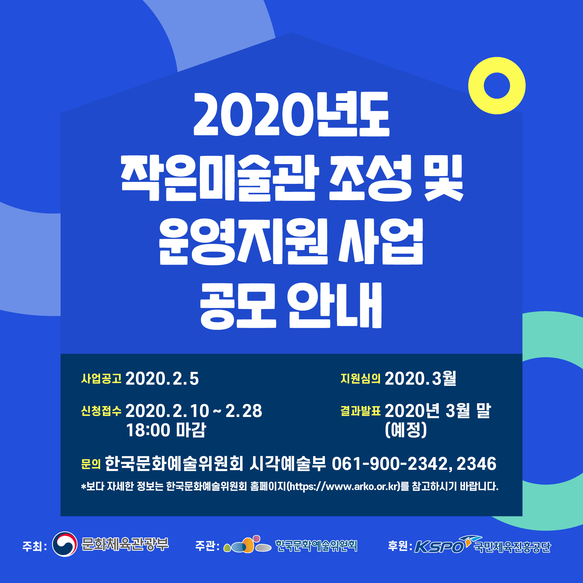 올해는 기존 작은미술관의 의견을 수렴해 공모 시기를 4월이 아닌 2월로 앞당겼고, 7억 원 예산과 11개관 개소로 지원을 늘렸다. 신규 미술관을 대상으로 기존 미술관의 운영 비법을 공유하는 상담(멘토링) 프로그램도 신설했다. 공모 분야는 신규 조성, 지속 운영, 전시 활성화 등 3가지이며, 선정된 기관에는 전시기획비와 인건비 등을 지원할 계획이다.