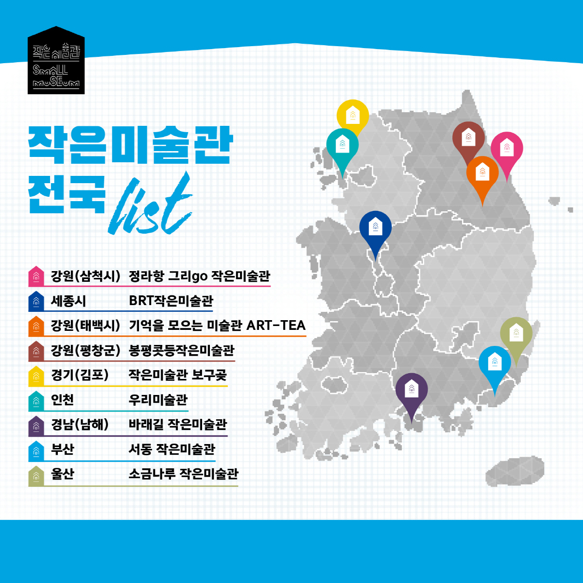 특히 작년에는 예산 6억 3천만 원으로 ▲인천동구 '우리미술관' ▲경남남해 '바래길 작은미술관' ▲경기김포 '작은미술관 보구곶' ▲강원평창 '봉평콧등 작은미술관' ▲부산금정 '서동 작은미술관' ▲강원태백 '기억을 모으는 미술관' ▲세종 'BRT 작은미술관' ▲울산 '소금나루 작은미술관' ▲강원삼척 '정라항 그리go작은미술관' 등 9곳을 지원했다.