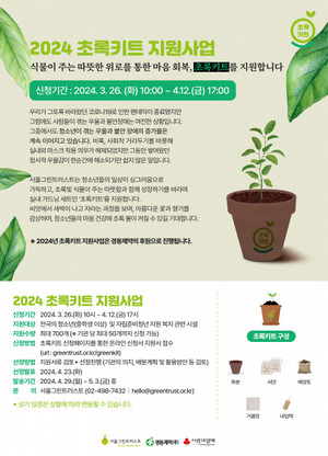 서울그린트러스트가 정서적 회복이 필요한 청소년들을 위한 '2024 초록키트 지원사업' 공모를 진행한다고 2일 밝혔다. 서울그린트러스트의 초록키트 지원사업은 녹색 복지에 소외된 사회적 약자들의 정서 회복을 위해 식물 가드닝 키트를 지원하는 사업이다. 2022년에 처음 시작해 올해로 세 번째 해를 맞았다. 서울 지역에 있는 사회적 약자를 대상으로 했던 2023년에 이어 2년 연속으로 경동제약, 사회복지공동모금회와 손을 잡고 정서적 회복이 필요한 전국의 청소년과 자립준비청년을 대상으로 초록키트를 지원할 예정이다.