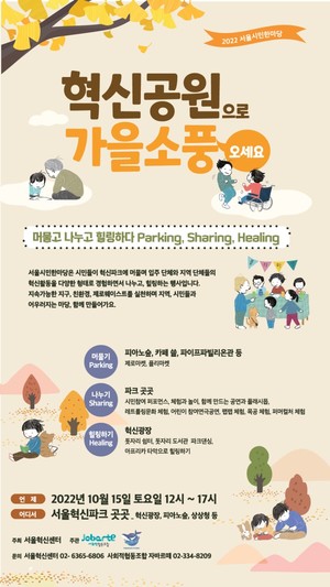 서울혁신파크에서 '2022 서울혁신파크 시민한마당-혁신공원(으로) 가을소풍(오세요)'이 개최된다.오는 15일 진행되는 서울혁신파크 시민한마당 행사는 코로나19로 지친 시민들에게 쉼과 다양한 체험 프로그램을 제공하는 행사로, 기후위기 등 우리 사회의 다양한 문제들을 체험과 놀이, 쉼을 통해 해결해 보는 즐거운 경험의 장이다.'혁신공원 가을소풍'은 친환경, 제로웨이스트를 기반으로 상업성을 배제한 축제이며, 올해는 "머물고 나누고 힐링하다"라는 슬로건 아래 시민들과 편안한 가을 소풍을 함께할 예정이다.'여는무대'에서는 공연 동아리 터울림