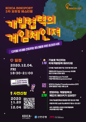 한국국제협력단 KOICA(이하 코이카)가 주최하고 신한은행이 후원하며, 사단법인 더 브릿지가 주관하는 온라인 토크 콘서트 '제 3차 브릿징 페스티벌: 개발협력의 게임체인져'가 오는 12월 4일 오후 6시 30분에 개최된다.코이카 이노포트는 국내외 사회문제 해결을 위한 개발협력과 사회혁신 허브 역할을 목표로 하는 사업으로, 올해 3월부터 시작된 코이카 프로그램이다. 전문성 있는 사회혁신가를 육성하고, 글로벌 사회문제를 해결하는 건강한 개발협력 사회혁신 생태계 조성이 목표다.제3차 브릿징 페스티벌은 '4차 산업혁명 기술을 활용한 개도국
