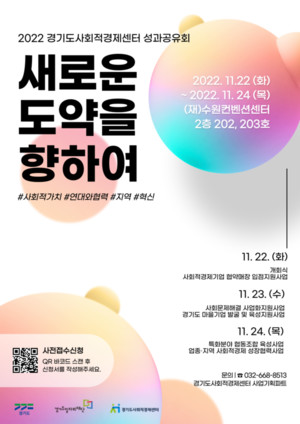 경기도사회적경제센터는 사회적경제 조직 간 협력과 연대를 촉진하여 사회적경제라는 가치를 확산하기 위해 '2022년 사업성과 공유회'를 개최한다. '새로운 도약을 향하여'라는 주제로 열리는 이번 행사는 11월 22일부터 24일까지 3일에 걸쳐 수원컨벤션센터에서 진행된다. 첫날인 22일에는 개회식과 ▲사회적경제기업협약매장 입점지원 사업을, 23일에는 ▲사회문제해결 사업화 지원사업 ▲경기도 마을기업 발굴 및 육성지원사업, 24일은 ▲특화분야 협동조합 육성 지원사업 ▲업종·지역 사회적경제 성장협력사업 성과 보고와 토크쇼가 예정되어 있다. 참