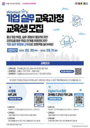 서울시여성가족재단이 IT 역량 기반 취업을 희망하는 서울시 미취·창업 여성을 대상으로 '기업 실무 교육과정' 참가자를 선착순 모집한다. 최근 업무 환경에서 필수적으로 요구되고 있는 AI 및 디지털 도구 활용 역량을 갖춘 실무형 인재 양성을 위함이다.이번 사업은 ▲AI 활용 사무 교육 ▲Digital Tool 활용 마케팅/디자인 직무 교육으로 나눠 지원한다. 먼저 'AI 활용 사무 교육'은 생성형 AI를 활용한 업무 역량 향상 및 직무 적응력 강화를 목표로 생성형 AI를 활용한 △문제 해결 △엑셀 고급 기능 △보고서 작성 △PPT 제