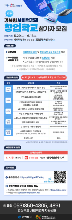경상북도사회적경제지원센터(이하 경북사경센터)는 사회연대경제 기업가를 발굴 육성하기 위해 '2024 경북형 사회적경제 창업학교' 참가자를 18일까지 모집한다고 밝혔다.경북형 사회적경제 창업학교는 경상북도의 지역경제 및 국내 사회연대경제(사회적경제) 활성화를 목적으로 2017년부터 운영되고 있으며 매년 150명 이상 참여하고 있다. 사회적경제에 관심있는 국민이라면 누구나 참여할 수 있다. 올해 창업학교는 AI시대에 대응하는 사회연대경제 교육과정으로 사회연대경제 기초 및 창업 실무에 대해 6월 22일부터 7월 13일까지 매주 토요일 4시