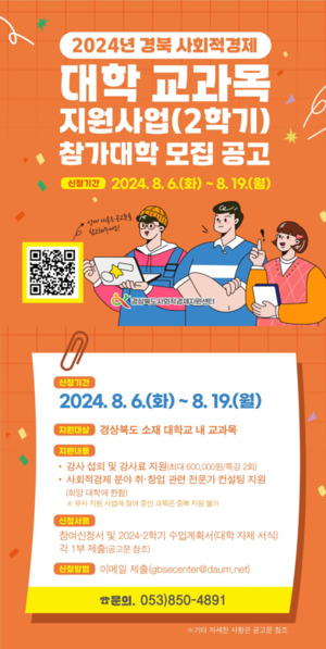 경상북도 사회적경제지원센터(이하 경북사경센터)가 2024학년도 2학기를 맞아 사회연대경제(사회적경제) 대학 교과목 지원사업을 수행한다고 25일 밝혔다. 사회연대경제 대학 교과목 지원사업은 경상북도가 사회연대경제에 대한 인식 확산과 전문 인재 양성을 목적으로 경북 소재 대학 사회연대경제 관련 교과목 수업 운영을 지원하는 사업이다. 해당 사업은 2019년부터 2024년 상반기까지 총 13개 대학, 24개 강좌를 지원했으며, 영남대학교, 대구한의대학교, 동국대학교 WISE 캠퍼스, 안동대학교 등 도내 대학들의 사회연대경제 인재 양성 활동