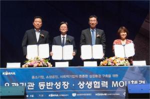한국사회적기업진흥원, 한국철도공사, 소상공인시장진흥공단, 중소벤처기업진흥공단이 2일 대전 코레일 사옥에서 열린 '동반성장 박람회'에서 '동반성장 재도약! 우리 모두 한 마음이 되겠습니다'라는 슬로건으로 동반성장, 상생협력 협약을 체결했다.협약을 통해 ▲사회적기업, 중소기업, 소상공인의 판로확대, 정보지원 및 경영환경개선을 위한 역량지원 ▲제도개선 등 공정한 거래문화 확산 ▲온‧오프라인 네트워크 활용 동반성장과 상생협력사업 홍보 등 다양한 분야의 협력 기반을 마련했다. 코레일은 전국 지역본부에서