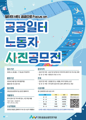 (재)공공상생연대기금이 공공기관 노동자의 일터를 기록하고 공공의 가치를 되새기기 위한 사진공모전을 연다.공공상생연대기금은 '제1회 공공부문 일터‧노동자 사진공모전'을 개최한다고 29일 밝혔다. 이번 공모전은 공공부문 노동 현장을 시민과 함께 기록하고, 공공서비스의 의미를 시각적으로 조명하고자 마련됐다.공모전은 일반인 부문과 공공기관 부문으로 나뉜다. 일반인 부문은 일상 속에서 마주친 공공기관 노동자의 모습이나, 공공서비스를 체감한 장면을 자유롭게 담은 사진이면 된다. 공공기관 부문은 해당 기관의 임직원과 직계가족(배우자, 자녀 포함
