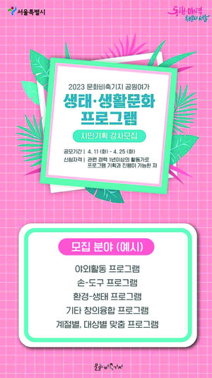 서울시 문화비축기지는 2023년 공원 여가문화 활성화를 위한 '2023 생태·생활문화 프로그램'에 참여할 시민기획 프로그램을 4월 11일부터 25일까지 공모한다.문화비축기지 '생태·생활문화 프로그램'은 시민들의 일상에 문화와 생태적 감수성을 더하는 공원 여가활동 프로그램으로, 매해 시민기획 공모를 통해 선정된 다양한 주제의 여가활동 프로그램들로 운영한다. '여성을 위한 장작 패기의 예술', '트리 클라이밍', '어바웃 보깅댄스', '독서하고 필사하며 즐기는 필라테스' 등 2018년부터 매년 6~10개의 공원 여가 프로그램을 진행하고