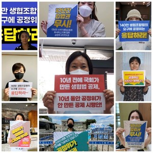 한국사회적경제연대회의는 21일 국회가 법률로 허용한 생협의 공제사업을 공정위가 가로막아서는 안된다는 입장을 담은 성명서를 발표했다.연대회의는 성명서를 통해 "공정위의 업무 태만으로 생협 조합원의 피해만 늘어나고 있다"며 "생협은 공제사업을 시행할 준비가 충분하다"고 밝혔다. 보다 투쟁 수위를 높여 대정부 투쟁에 나설 것이라고 밝혔다.현재 장은 세종시에서 ‘무기한 단식투쟁’에 들어간 상태다.또 서울에서는 북부지부가 청와대 앞에서 1인 릴레이 시위를 진행하고 있으며 남부지부는 여의도 민주당 앞에서 릴레이 시위를 이어오고 있다. 인천시