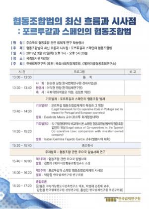 (재)아이쿱협동조합연구소가 바람직한 협동조합 법체계에 대한 시사점 마련을 위해 국제심포지엄에 협력한다. 한국법제연구원이 주최하고 국회사회적경제포럼이 후원하는 국제심포지엄 "협동조합법의 최신 흐름과 시사점 – 포르투갈과 스페인의 협동조합법"이 오는 26일 오후 1시30분, 국회도서관 대강당에서 개최된다.스페인과 포르투갈은 국내에 많이 소개되지는 않았지만 협동조합과 사회적경제가 활발하게 발전되고 있는 곳으로 사회적경제법이 제정되어 있으며, 모범적인 협동조합법을 갖추고 있는 곳으로 평가받고 있다. 심포지엄의