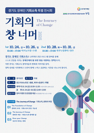 경기도장애인복지종합지원센터(이하 누림센터)는 경기도 장애인 기회소득 정책의 성과를 공유하고 도민의 공감대를 확산하기 위한 특별전시회 '기회의 창 너머 2025(The Journey of Change)'를 개최한다.이번 전시는 10월 24일부터 26일까지 수원 아브뉴프랑 광교, 10월 28일부터 31일까지 양주 북부누림센터에서 각각 진행된다. '기회소득'은 장애인이 꾸준한 건강 프로그램에 참여하면 월 10만원의 지원금을 제공받는 경기도의 대표적인 복지 정책이다. 경제적 지원을 넘어 스스로 건강을 관리하고 사회 참여를 촉진함으로써 장애