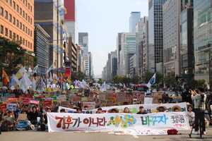 >>>>> 사진을 넘겨주세요 >>>>> 지난 27일, 서울을 비롯해 부산·대전·제주·청주 등 전국 여섯 개 지역에서 '9·27 기후정의행진'이 동시에 진행됐다. 서울 도심에서는 참가자들이 종각과 시청 일대를 행진하며 기후위기의 심각성을 알리고 대응을 촉구했다. 서울 집회에는 환경단체 활동가와 노동자, 농민, 청년, 종교계까지 폭넓은 시민이 모여 약 3만 명이 함께한 것으로 집계됐다. 참가자들은 노래와 구호를 외치며 거리를 행진했고, 마지막에는 도로에 드러누워 '죽음을 상징하는' 다이인 퍼포먼스를 선보여 위기의 현실을 몸으로 표현했다
