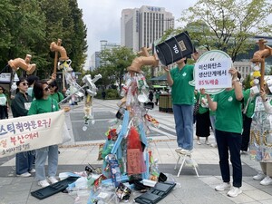 플라스틱은 화석연료의 다른 이름이다.국제사회는 플라스틱 오염 종식을 위한 실효성 있는 성안을 완성하라.플라스틱 오염 종식을 위해 생산단계에서부터 구속력 있는 규제안을 마련하라.11월 25일 부산서 열리는 '플라스틱 오염 대응 국제협약 성안을 위한 제5차 정부간협상위원회(INC-5)'를 앞두고 (사)소비자기후행동과 서울iN아이쿱생협이 플라스틱 오염 종식을 촉구하는 대행진을 7일 덕수궁 대한문 앞에서 펼쳤다. 이들은 선언문 낭독으로 "(5차 회의를 앞두고)산유국 중심의 당사자 그룹은 플라스틱 전 생애 주기를 다루기보다 폐기와 재활용에