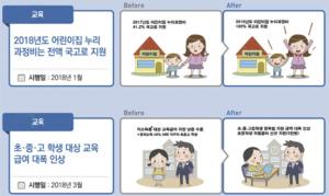2018년 1월 1일부터는 최저 시급이 지난해에 비해 대폭 오르고 신입사원들에게도 '연차'가 보장된다. 또 노동자의 고용안정을 위해 사업주에게 일자리 안정자금을 지원한다. 의료비 본인부담상한액이 대폭 인하되는 것은 사회적 약자의 의료비 부담 경감을 위해 중증질환자나 희귀 난치성질환자에 대해 1월 1일 이후 지출한 의료비에 대해서는 한도없이 세액공제가 적용된다.2018년을 본격적으로 시작하기에 앞서 올해부터 달라지는 다양한 정책들 중 우리 생활과 가장 밀접한 정보들을 모아 정리했다. 일자리‧일반행정‧