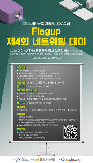 사회 양극화 해소와 건강한 사회를 목표로 일자리 사업을 진행해온 함께일하는재단에서 오는 2월 3일, 코로나19 극복 재도약 프로그램 Flagup 제4회 네트워킹 데이를 개최한다. 이번 행사는 ▲2023년 창업 생태계와 트렌드 분석 ▲빠르게 변화하는 시장 트렌드 확인 및 준비사항 체크의 강연으로 구성될 예정이다.참가 대상은 (예비)소셜벤처 및 사회적기업 창업을 희망하거나 관련 정보가 필요한 사람, 그리고 동료 소설리더와 만남과 네트워킹을 희망하는 사람들이다. 참석을 원하면 2월 3일 오후 6시까지 위 포스터의 QR코드나, 플래그업 홈